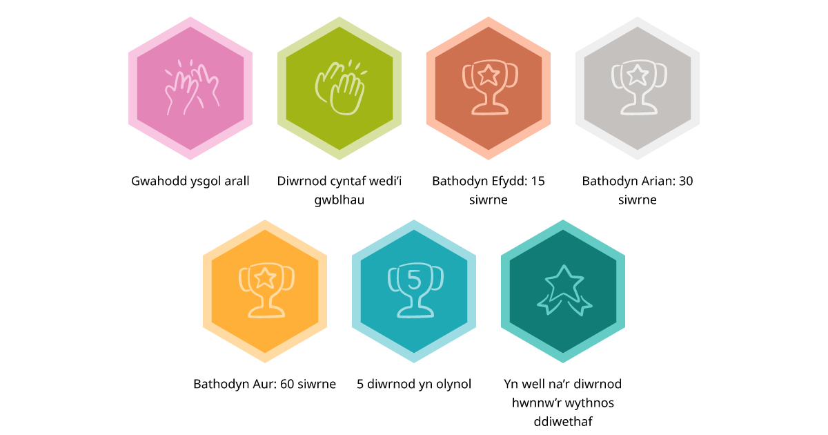 Mae’r bathodyn dosbarth ar y blaen yn nwylo…